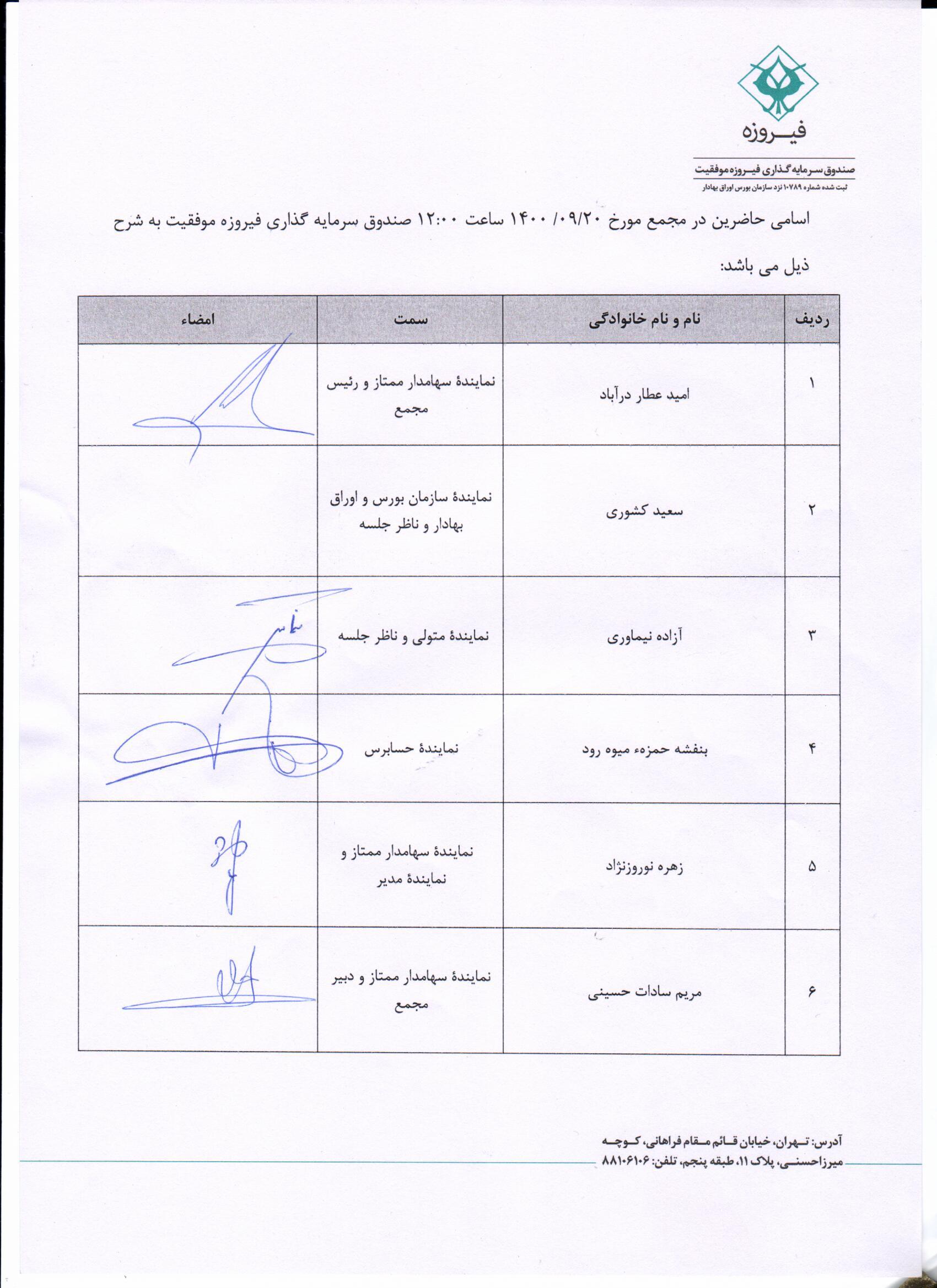 اسامی حاضرین در جلسه مجمع سالانه منتهی به 1400/06/31 روز شنبه مورخ 1400/09/20ساعت 12:00 |