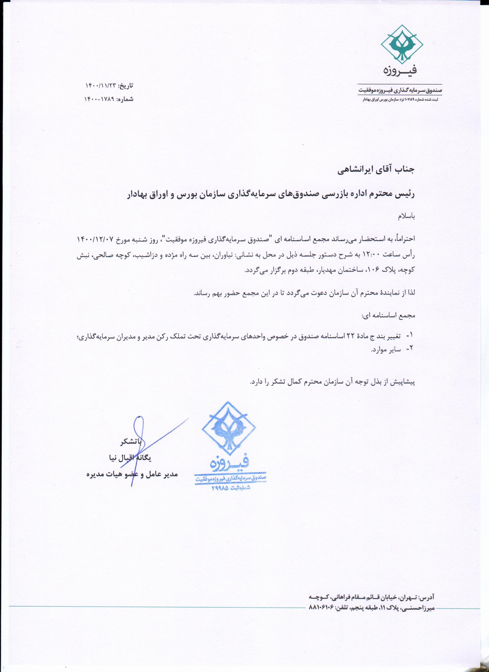 | منبع | آگهي دعوت به مجمع اساسنامه اي مورخ 14001207 صندوق فيروزه موفقيت |