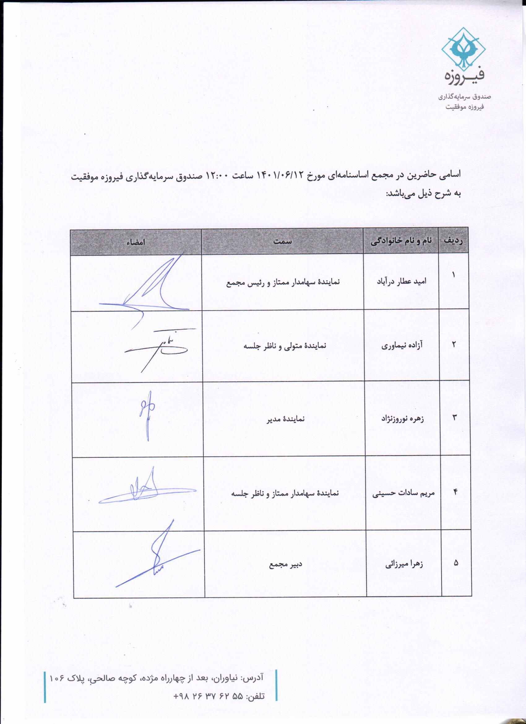 لیست حاضرین مجمع اساسنامه ای مورخ 14010612 صندوق فیروزه موفقیت |