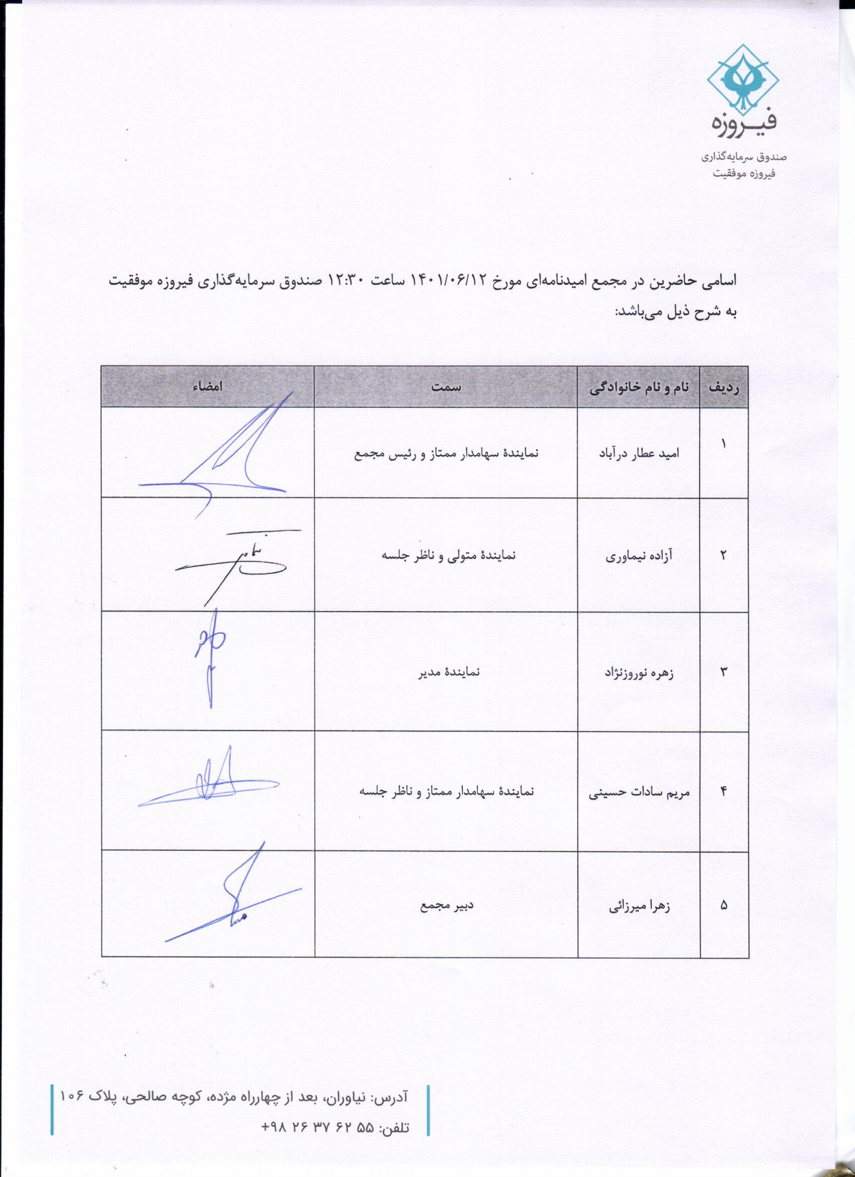 لیست حاضرین مجمع امیدنامه ای مورخ 14010612 صندوق فیروزه موفقیت |