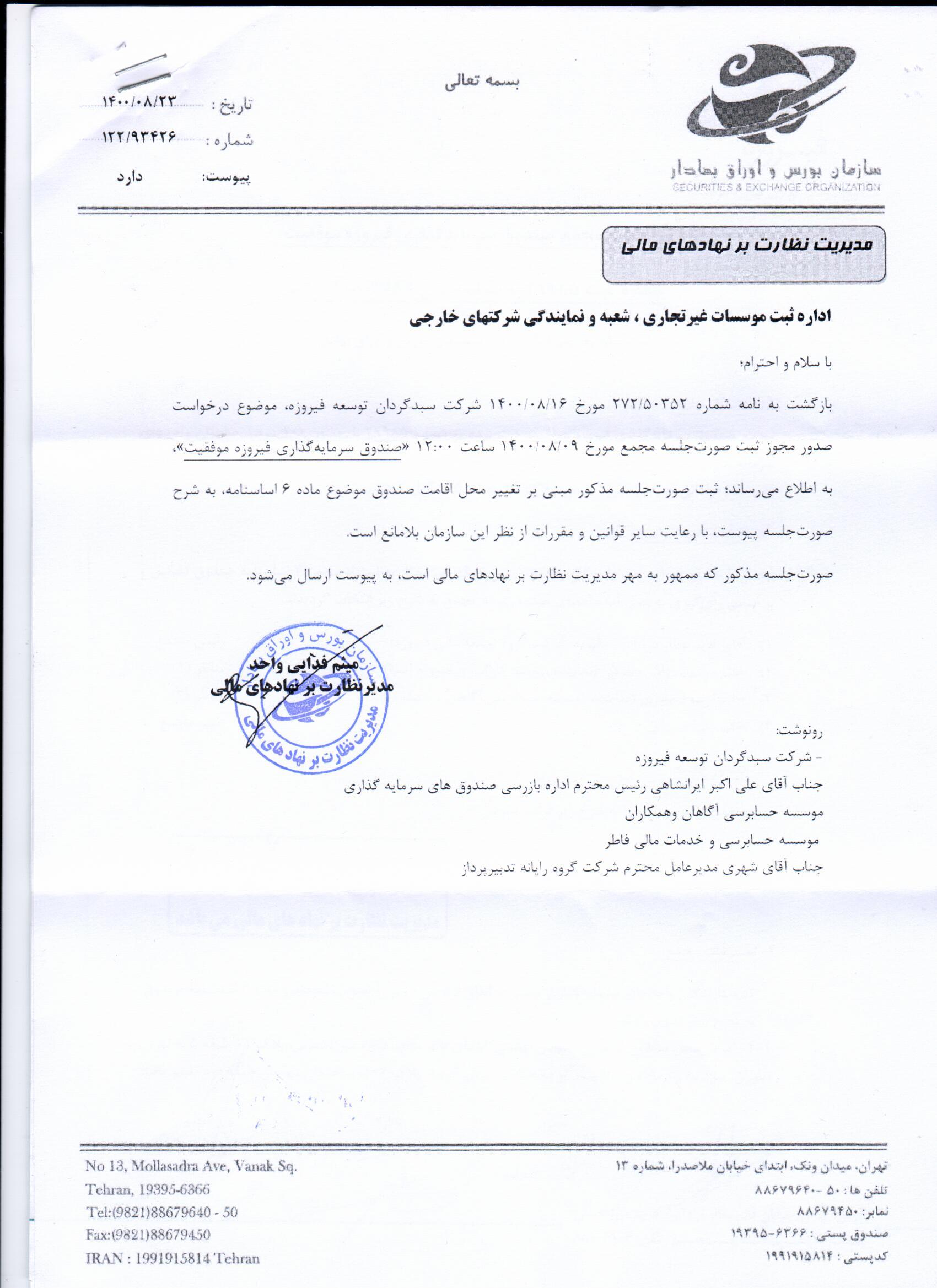 تصميمات مجمع امیدنامه ای ساعت 12.30 مورخ 1400/09/20 صندوق سرمايه گذاري فيروزه موفقيت