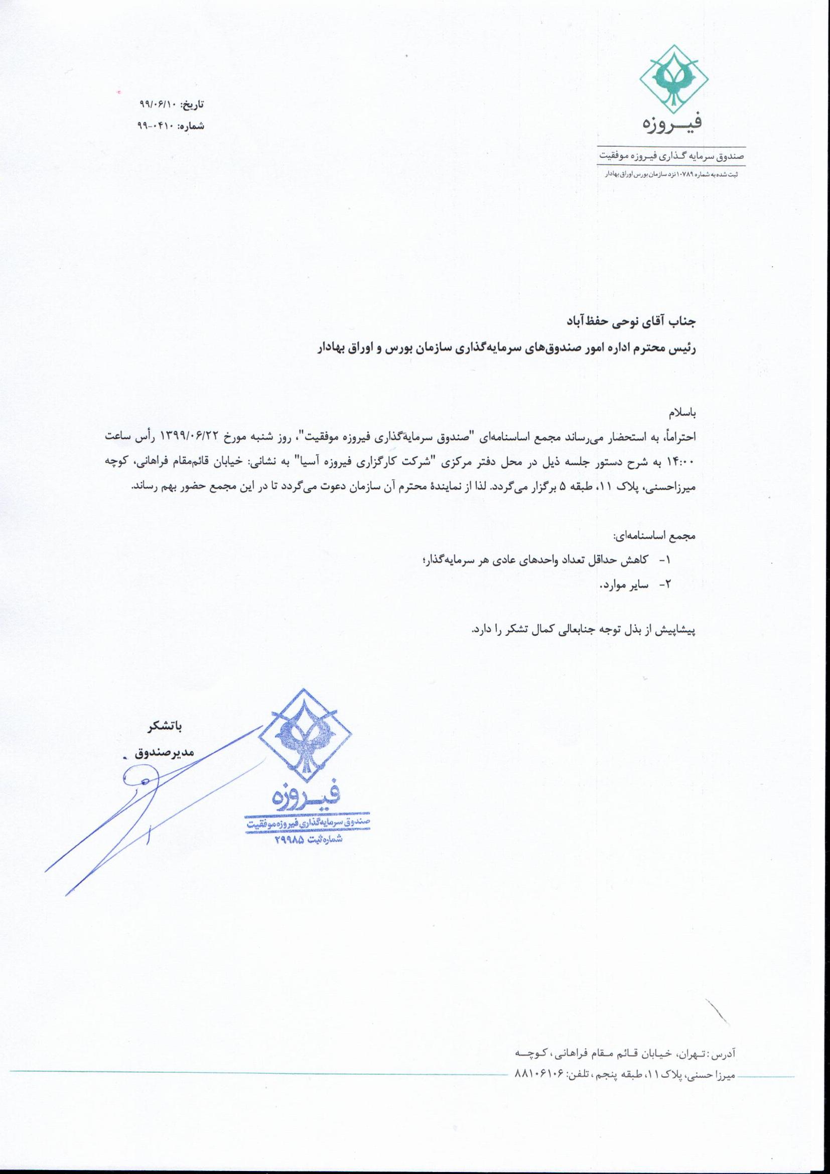 آگهی دعوت به مجامع اساسنامه ای و امیدنامه ای مورخ 13991008 صندوق فیروزه موفقیت